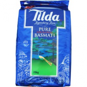 Product DetailsTilda Basmati Rice 20 Kg Tilda Legendary rice is pure original basmati: We select the unique, fragrant and delicate basmati grains from over 10,000 independent farmers whom we know by name by Fame using methods handed down through generations they hand tend their crops in the Himalayan foothills - the only place on earth, where basmati can be grown, Here the snow fed rivers, rich soil and unique climate, combine to give Tilda basmati its Tentalising flavour, delicate texture and magical aroma. Our Belief: We believe basmati is the finest rice in the world, that's why we are so committed to guarding the quality and heritage of this legendary grain, for over 30 years our family business has been closely involved in supporting the basmati farming communities. At the heart of basmati is the farming community , we depend on it for our business and therefore work closely with the farmers to improve thei community. Our commitment: We only buy the best basmati and insist on an honest and fair partnership with farmers. Grains of Truth: We use state of the art DNA testing to check the purity of the basmati rice we buy, ensuring the unique characteristics of basmati -long slender grains with a delicate texture, delicious unique taste and tantalising aroma, Every grain is meticulously cleaned and miled with broken and discoloured grains removed. How to use: We recommend you store Tilda Basmati in this durable and water proof bag, Reseal the bag after use to ensure continued quality and freshnessm, keep this bag in a cool dry place. Alternatively, basmati should be stored in an airtight container. Cooking Tilda Basmati: Everyone has their own preferred way of cooking basmati, This is our favourite, Allow 60g of uncooked rice per person (approx 1/2 cup)1 measure dry rice, 2.measure water. 1. for best result we recommend you to soak the rice in cold water for 30minutes, then rinse in a sieve with cold water2.Take a large pan and add 2 measures of cold water to 1 measure of basmati3. Bring to boil, reduce to low heat cover and simmer for 10-12mins, until the water id absorbed, Avoid opening the lid or stir the rice4. Remove from heat, stand covered for 5mins5. Lightly fork through the grains before serving Alternative: Rinse uncooked rice with cold water, add to a large pan of boiling water, cook on medium heat for 10-12mins, drian wll and stand for 3mins, Lightly fork through the grains and serve. Tilda is putting together a legendary rice recipe collection online, we want to hear from you if you have a legendary recipe passed down amongst your family, if we share you recipe online we will reward you with a years worth of free Tilda basmati rice (5 Bags of 5Kgs), send in your recipe online at recipes@tilda.com or write to us at Tilds Ltd, Legendary Recipe Collection, Po Box 550, Rainham , RM13 9AE. For recipes and ideas visit www.tilda.com, Why not try our range of 2minutes Microwaveable Tilda steamed Basmati recipe rices. Ingredients:- Pure Basmati Rice, Sun-Kissed legendary rice, nothing else, Milled and packed in the uk from an imported ingredient. Nutritional informationEnergy 1505/855Protein 9.0gFat 1.5g%Carbohydrates 76.7gFibre 0g%