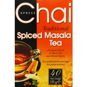 Fudco Tea Chai Express Spiced bags (40 bags) Premium Blend of black tea and mixed spices, No Artificial flavourings No Preservatives Exotic Cuisine is our sepciality with over 35years of experience,Our experts have travelled around the globe sourcing the finest tea blends and purest authentic spices for our range of teas, We take great care to deliver you a perfect cup every time. Chai Xpress brings you an, exquisite blend of black teas from around the world , Expertly blended with the purest authentic spices, for a fult flavour and refreshing taste , This traditional spice tea is enjoyed in india and around the globe , An exotic experience any time of the day, Ingredients: Blended black tea , Ginger, cardamom, cinnamon, Black pepper, cloves, nutmeg, white pepper. Tea : Is rich in antioxidants Mixed Spices: Provides a warm aramatic and refreshing taste , For centuries spices used in this traditional blend have been used to aid digesstion. Brewing Instructions: Alway boil freshly drawn cold water as the oxygen in the water brings out the best flavour of the tea, brew with freshly boiled water for 3-5minutes, Add a little milk & sugar if preffered. Our Promise: we are happy to refund or replace any chaixpress product which fails below the high standards you expect , This does not affect your statutory rights, Please send to the address below , Storage : Store in a cool and dry place away from sunlight or strong odours Nutritional informationEnergy 10kcal/2kcalProtein TraceFat TraceCarbohydrates 0.3gFibre Trace