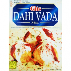 Gits Dahi Wada Mix 500g: Ready to cook savory Rice pan cake dry mix, 100% Vegetarian, No preservatives, No artificial Flavour or colour,Urad dal " Vada" Deep fried & soaked in yogurt , topped with tamarind sauce and garnished with popular indian spices.How to prepare:1. Mix Content of this pack with 500ml of water , stir to a smooth batter and set aside for 10mins.2. Gently stir mixture before use,heat oil 500ml place tablespoonfull of batter individually and fry on medium flame till crispy and light brown drain excess oil and cool for 3-5mins,3. Soak in water for 10mins , gently press each vadai to drain of excess water , immerse in beaten yogurt for 10mins, garnish with roasted cumin seeds, red chilli powder, salt, coriander leaves, tamarind sauces and yogurt serve cold.Tip: Add ginger and green chilli paste to the batterIngredients: Lentils flour , wheat flour partially hydrogenated vegetable oil,bicarbonate citric acid, cumin seeds, butylated hydro oxyanisole.Nutritional InformationEnergy 411kcalProtein 4.6gFat 1.7gCarbohydrates 16.3gFiber 0.8g